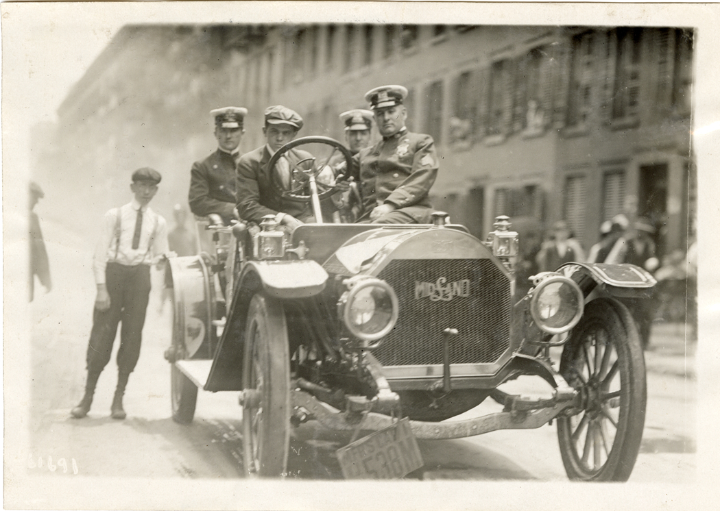 View of a driver and three uniformed men posing in a Midland car. Stamped on back: "Spooner & Wells, Inc., photographers, telephones 3472-3473 Columbus, 1931 Broadway, New York." Handwritten on back: "Midland, ca. 1910."