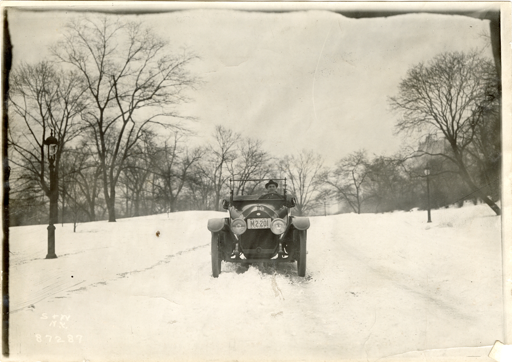 Front view of a motorist posing in a Mitchell car on a snow-covered road. Printed on front: "S & W, N.Y." Handwritten on back: "Mitchell, c.1916."