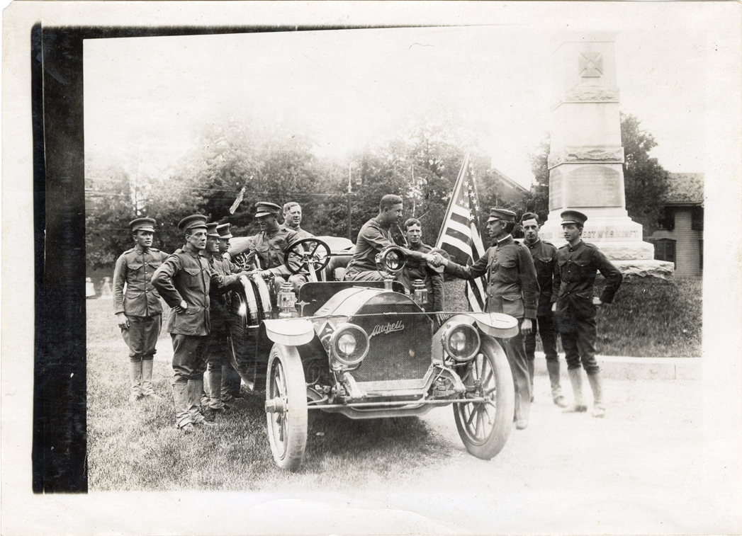 View of motorists in a Mitchell car greeting group of soldiers. Monument is partially visible in background. Stamped on back: "Photo by Spooner & Wells, Inc. 1931 Broadway, N.Y." Handwritten on back: "Mitchell, c.1910."