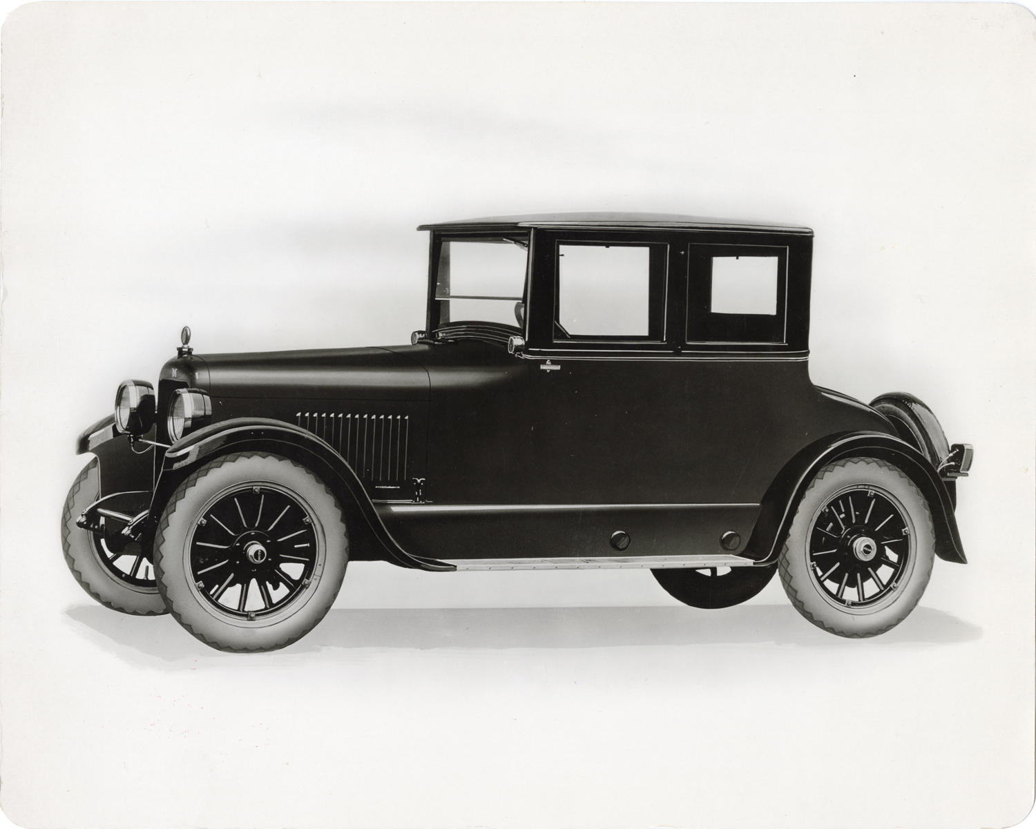 Artist's depiction of a Mitchell F-50 car. Label on back: "The new F-50 Mitchell, 4-pass. standard coupe. Mounted on 120" wheelbase chassis, wood wheels, 32 x 4-1/2" cord tires, equipped with 50 h.p. motor, 3-1/2" bore by 5" stroke; stop light, windshield cleaner, dome and reading lights, heater, eight day clock; done in Mitchell blue or maroon with hairline stripe and black upper panels. Mitchell Motors Company, Incorporated. Racine, Wisconsin." Handwritten on back: "Mitchell."