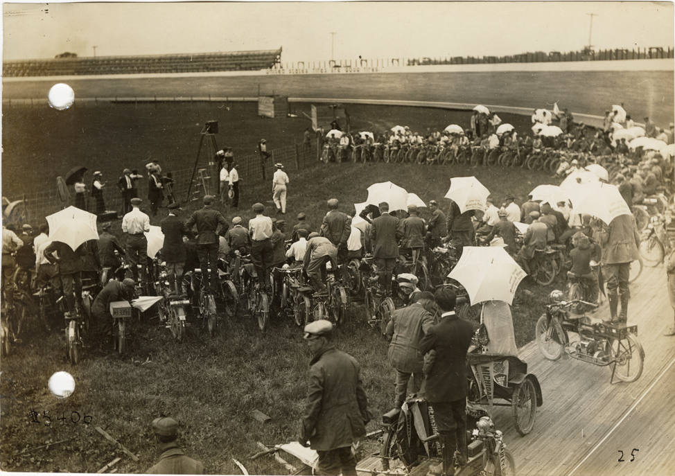 Crowd of motorcyclists with motorcycles at side of racetrack, 1912 Federation of American Motorcyclists meet