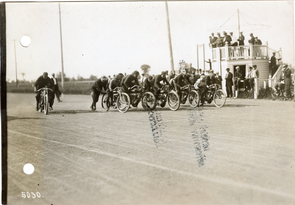 Start of motorcycle race, 1912 Michigan State Fairgrounds meet