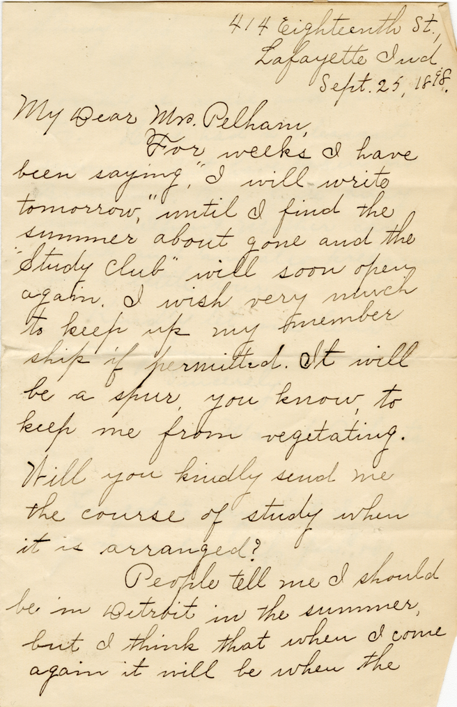 Letter from Maud Roberts to Mrs. Pelham of the Detroit Study Club requesting the course of study.