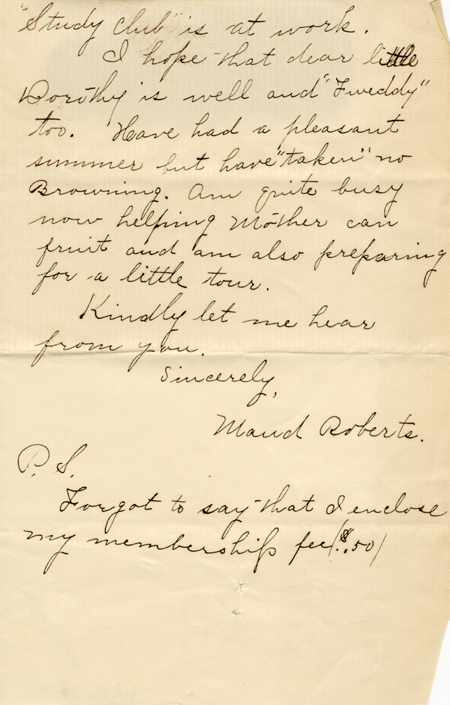 Letter from Maud Roberts to Mrs. Pelham, Detroit Study Club