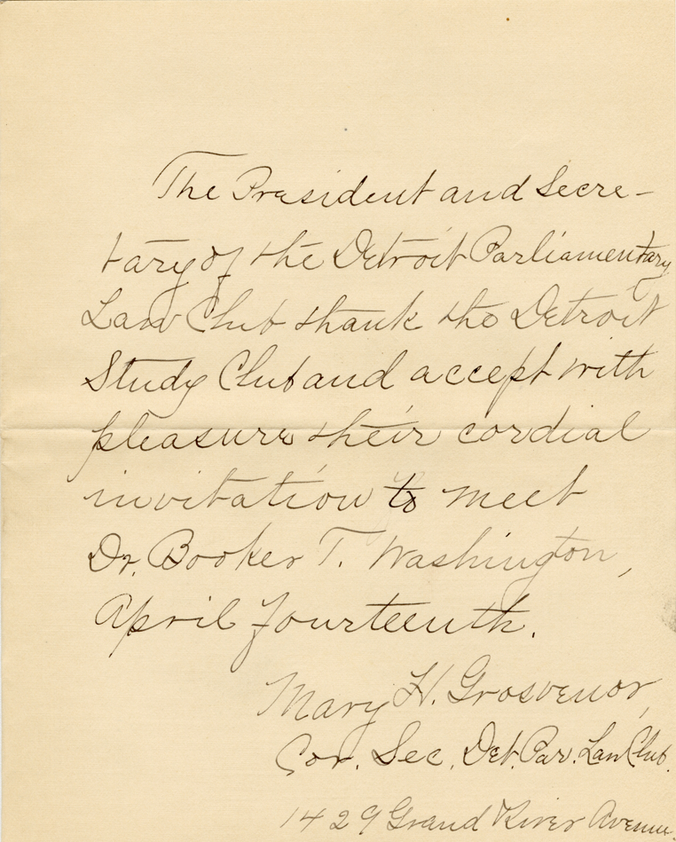 Letter from Mary H. Grosvenor, corresponding secretary of the Detroit Parliamentary Law Club, to the Detroit Study Club accepting their invitation to meet Booker T. Washington. The Detroit Study Club hosted Dr. Booker T. Washington at the home of Mrs. C.S. Smith on April 14, 1910.