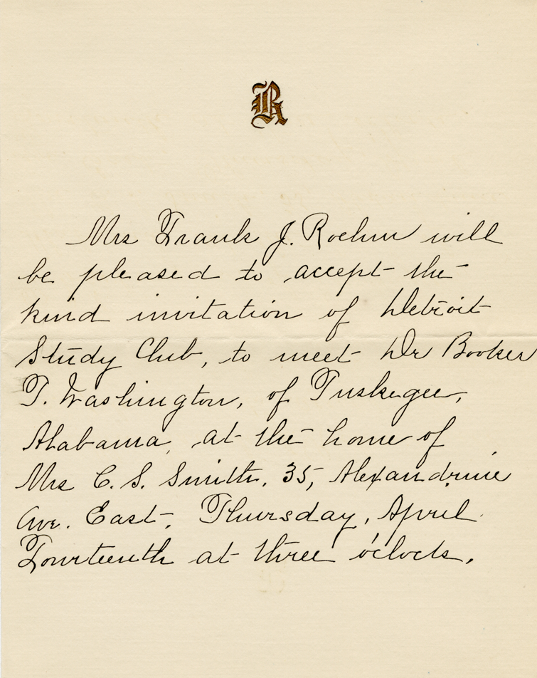 Letter from Mrs. Frank J. Roehm to the Detroit Study Club accepting their invitation to meet Booker T. Washington. The Detroit Study Club hosted Dr. Booker T. Washington at the home of Mrs. C.S. Smith on April 14, 1910.