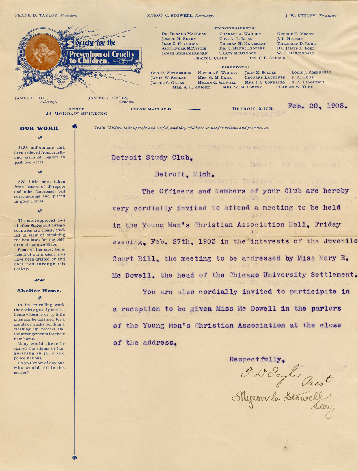 Letter from Frank D. Taylor, President, and Myron C. Stowell, Secretary, of the Society for the Prevention of Cruelty to Children, to the Detroit Study Club. The letter invites the Club to a discussion of the Juvenile Court Bill by Mary E. McDowell, head of the Chicago University Settlement.