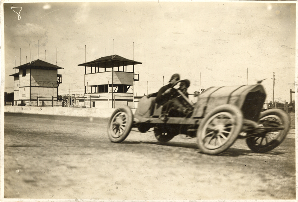 View of Joe Dawson and passenger racing National car on track. Handwritten on back: "Dawson in National, winner."