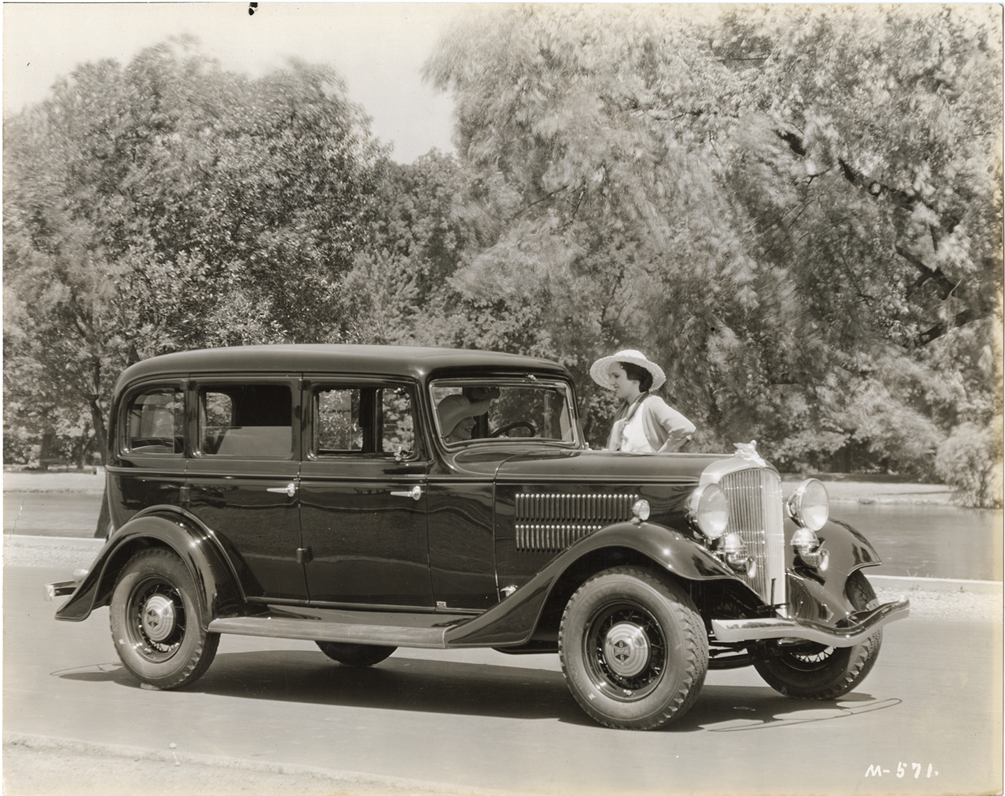 View of women motorists posing with a 1933 Essex Terraplane 6 Special Deluxe sedan. Handwritten on back: "July 14/33. 3/4 r. front. Essex Terraplane 6 Special Deluxe sedan with models. Hudson, 1933."