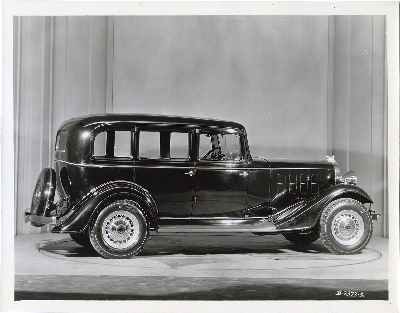 View of a 1933 Essex Terraplane 8 Series KT sedan. Handwritten on back: "Feb. 27, 1933. Model KT, Terraplane 8 sedan."
