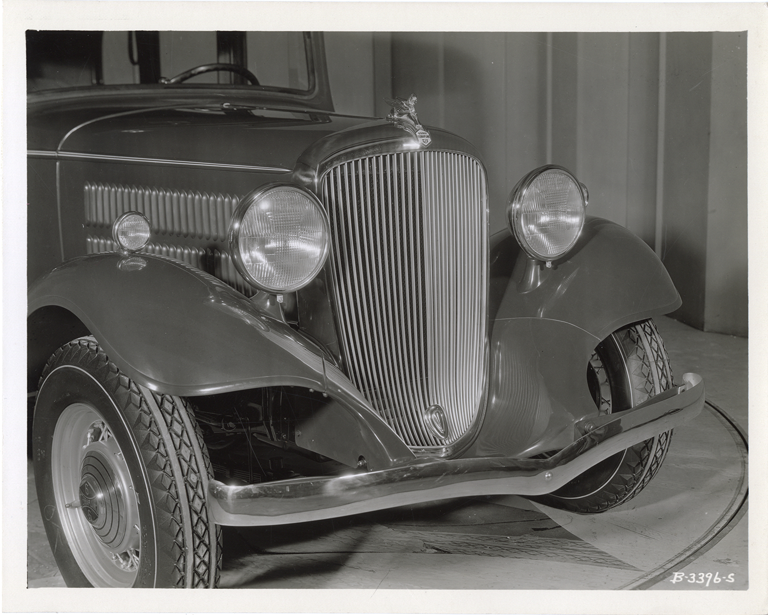 Close-up view of the front end of a 1933 Essex Terraplane 6 Series K Special sedan showing gryphon radiator ornament, headlamps and grille. Handwritten on back: "Feb. 27, 1933. Model K, Terraplane 6 Special sedan."