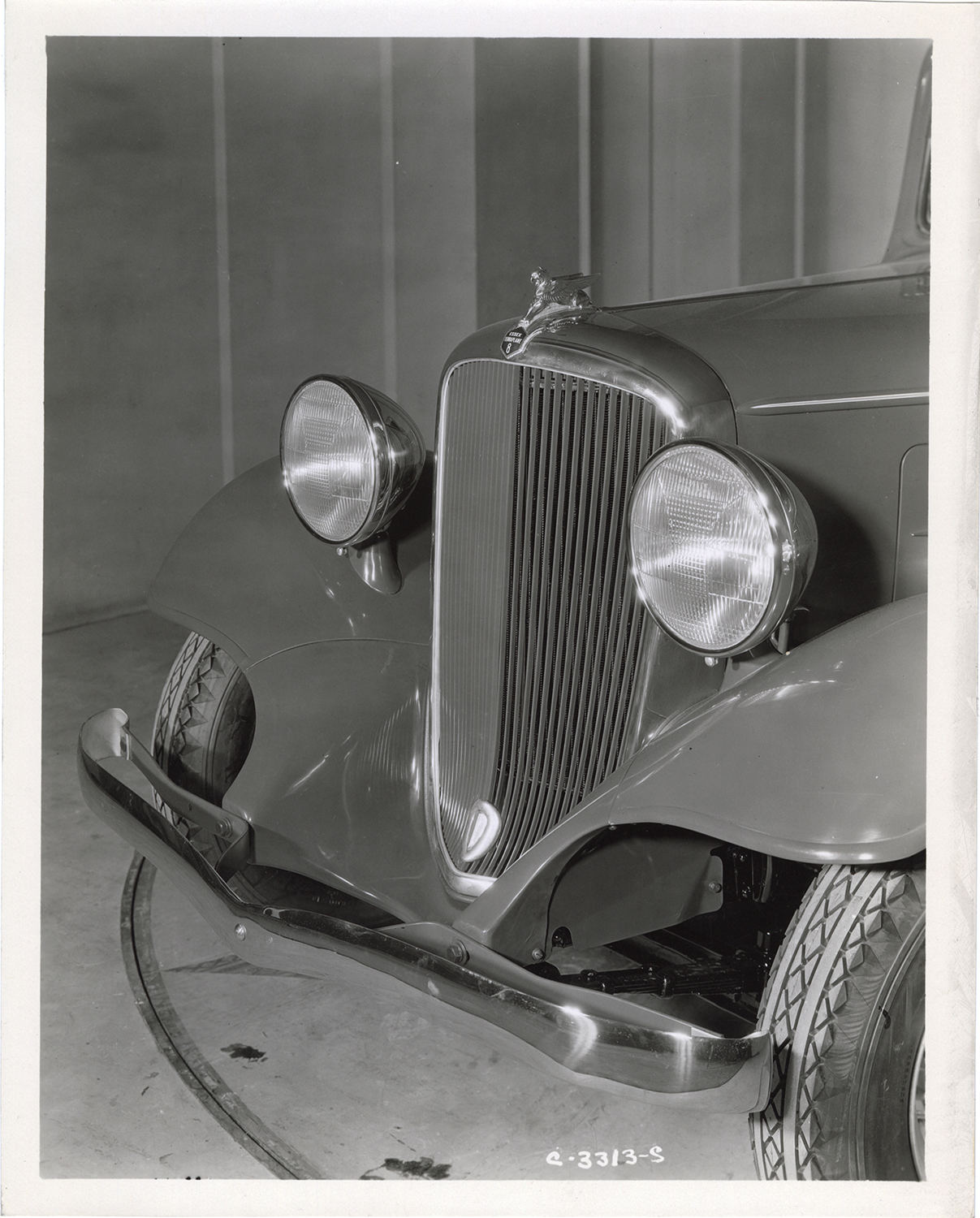 Close-up view of the front end of a 1933 Essex Terraplane 8 Series KT coach showing gryphon radiator ornament, headlamps and grille. Handwritten on back: "2-27-33. Model KT, Terraplane 8 coach."