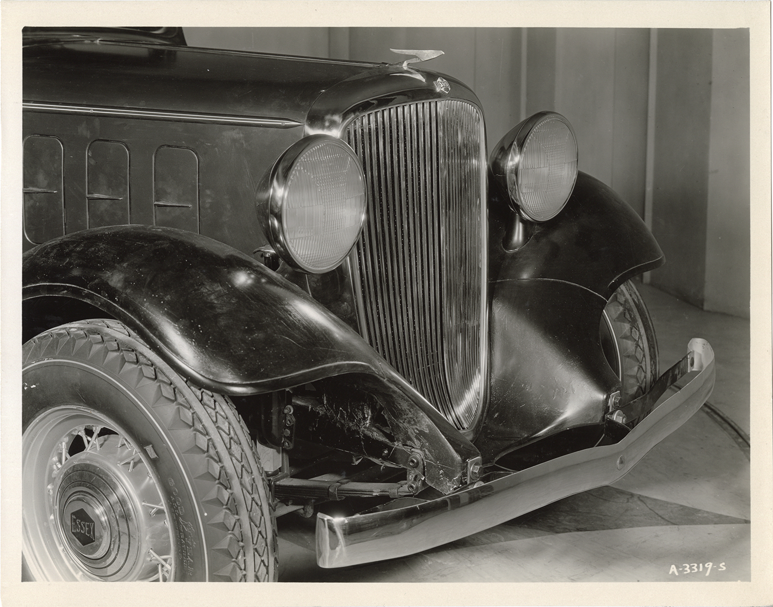 Close-up view of the front end of a 1933 Essex Terraplane 8 car showing radiator ornament, headlamps and grille. Handwritten on back: "Nov. 14/32."