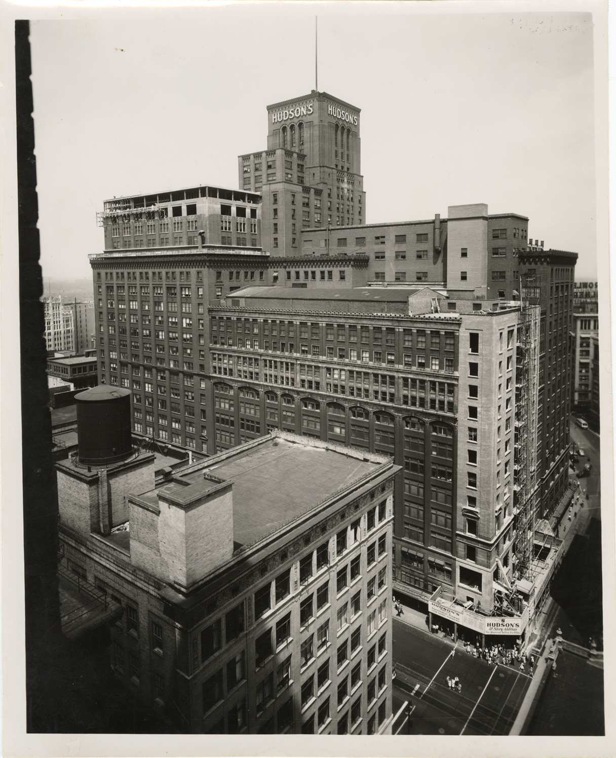 View of J.L. Hudson Company department store addition during construction. Sign on building reads: "Hudson's 12 story addition for improved selling facilities." Handwritten on back: "Hudson's addition, 1946."
