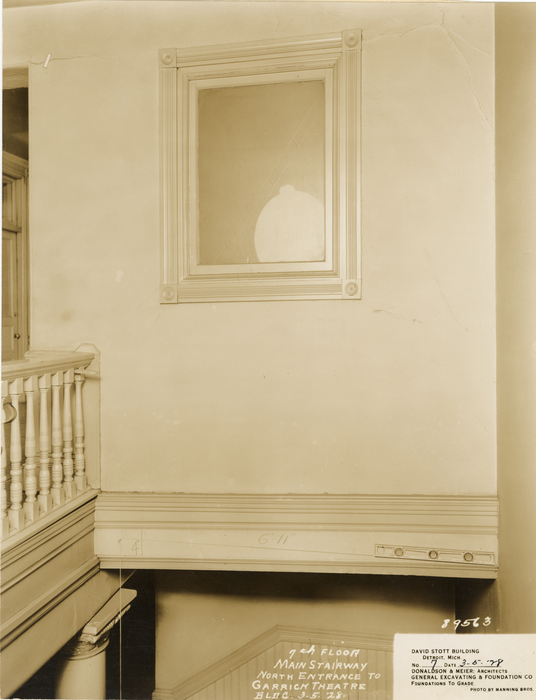 View of the stairway at the 7th floor, north entrance of the Garrick Theatre, taken during construction of the David Stott Building. The Stott Building was designed by Donaldson and Meier. Printed on front: "7th floor, main stairway, north entrance to Garrick Theatre bldg., 3-5-28. David Stott Building, Detroit, Mich. No. 7. Date: 3-5-28. Donaldson & Meier architects. General Excavating & Foundation Co. Foundations to grade. Photo by Manning Bros."
