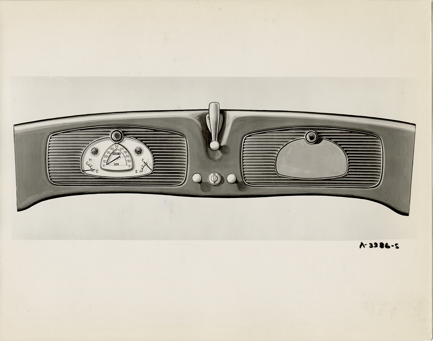 Artist's depiction of the instrument panel for a 1933 Hudson car. Handwritten on back: "Dec. 7/32. Copy negative of E, T & L instrument panel."