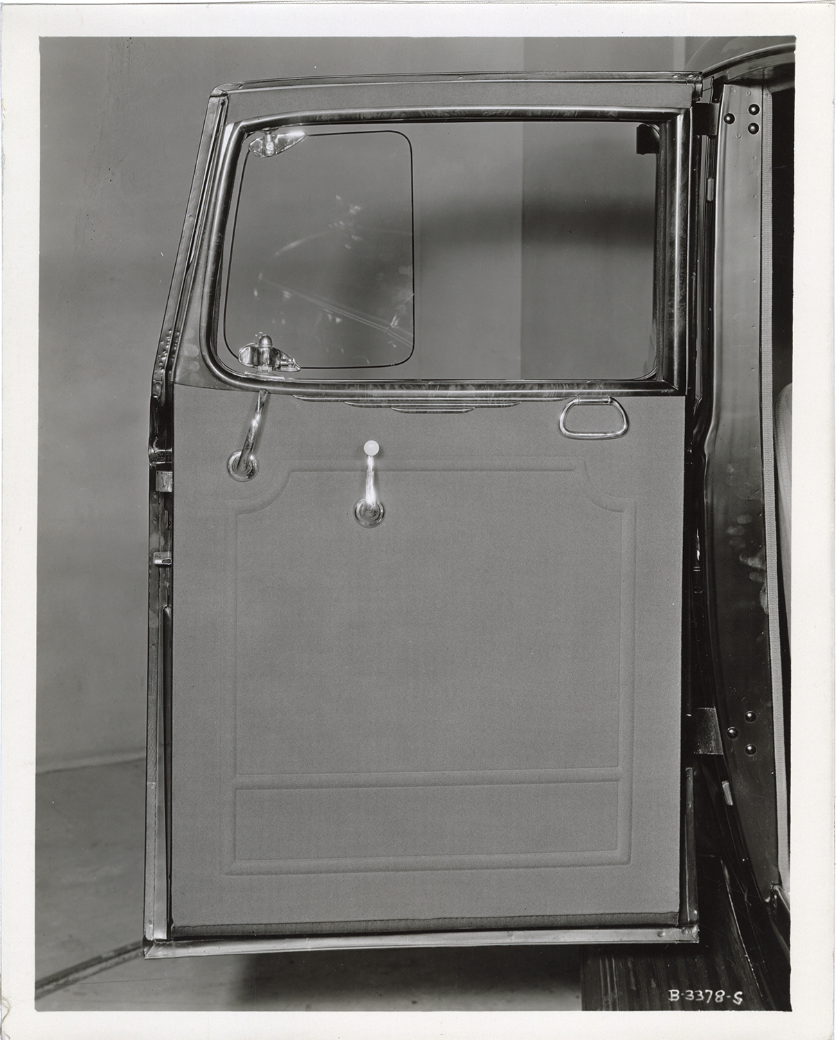 Close-up view of the front door in a 1933 Essex Terraplane 8 Series KT sedan. Handwritten on back: "Feb. 27, 1933. Model KT, Terraplane 8 sedan, front door interior."