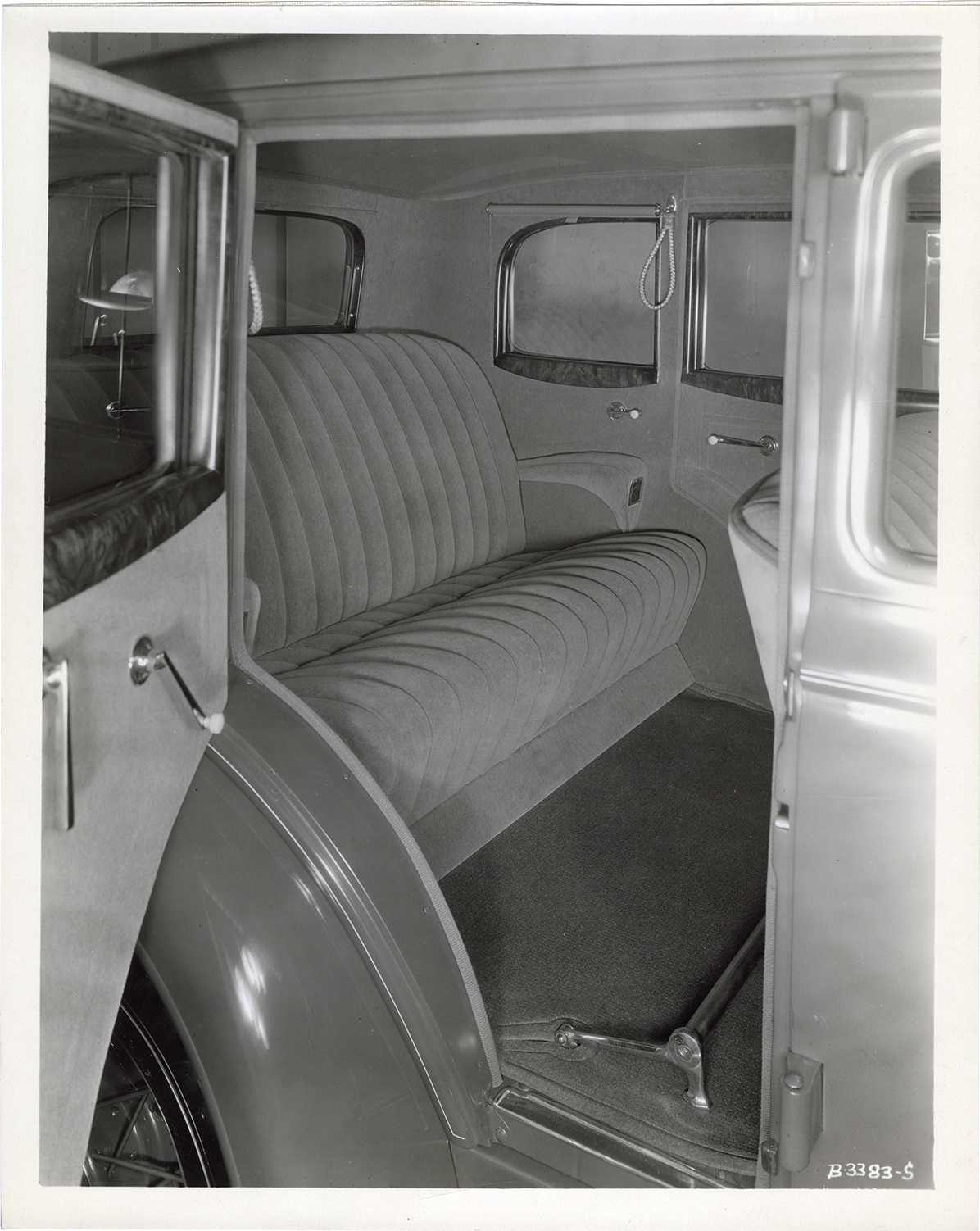 View of the rear seat in a 1933 Hudson Super Six Series E sedan. Handwritten on back: "Feb. 27, 1933. Model E, Hudson Super Six sedan, rear int."