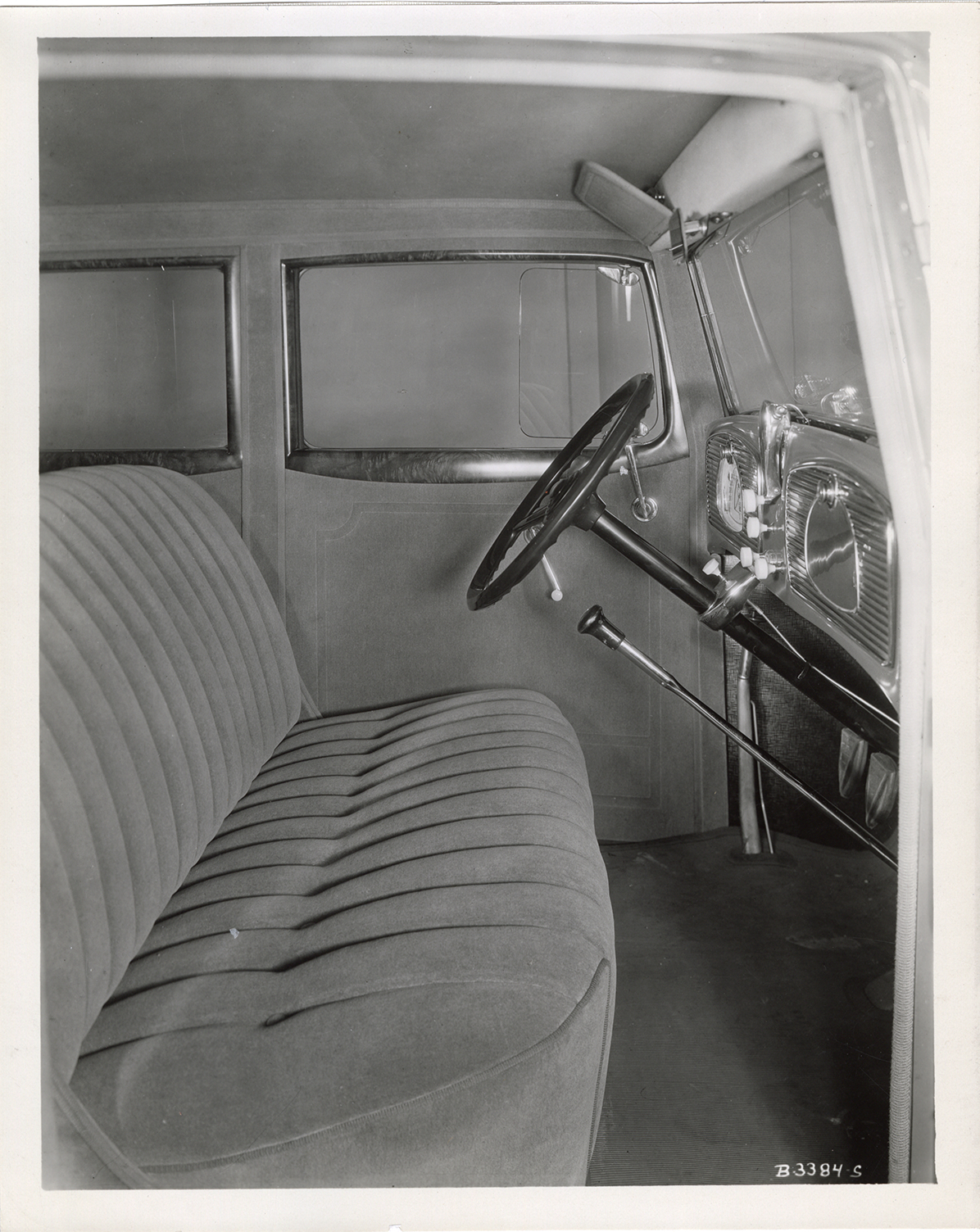 View of the front seat and steering wheel in a 1933 Hudson Super Six Series E sedan. Handwritten on back: "Feb. 27, 1933. Model E, Hudson Super Six sedan, front interior."