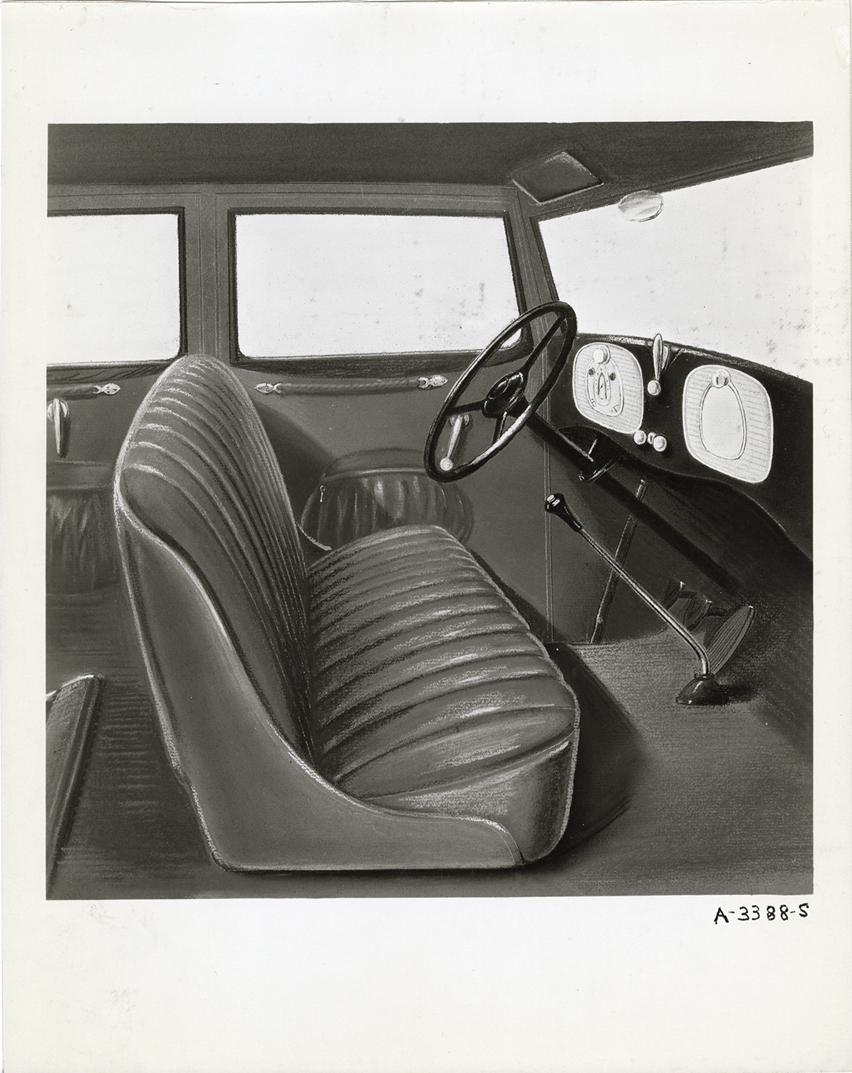 Artist's depiction of the front seat and steering wheel in a 1933 Hudson 8 Standard Series T sedan. Handwritten on back: "Dec. 8/32. T, 119" wb. Hudson Eight Standard Series, front interior. Copy of pastel color drawing."