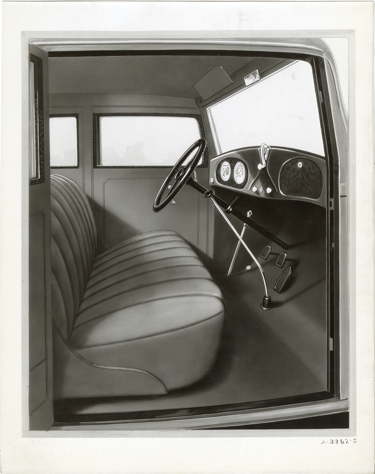 Artist's depiction of the front seat and steering wheel in a 1933 Essex Terraplane Series KT or K Special sedan. Handwritten on back: "Nov. 30/32. K Special or KT sedan, front interior."