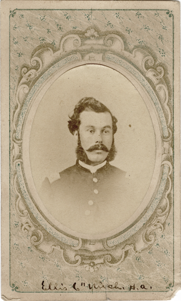 Portrait of James A. Ellis in military uniform. Handwritten on front: "Ellis. 6" Mich. H.A."