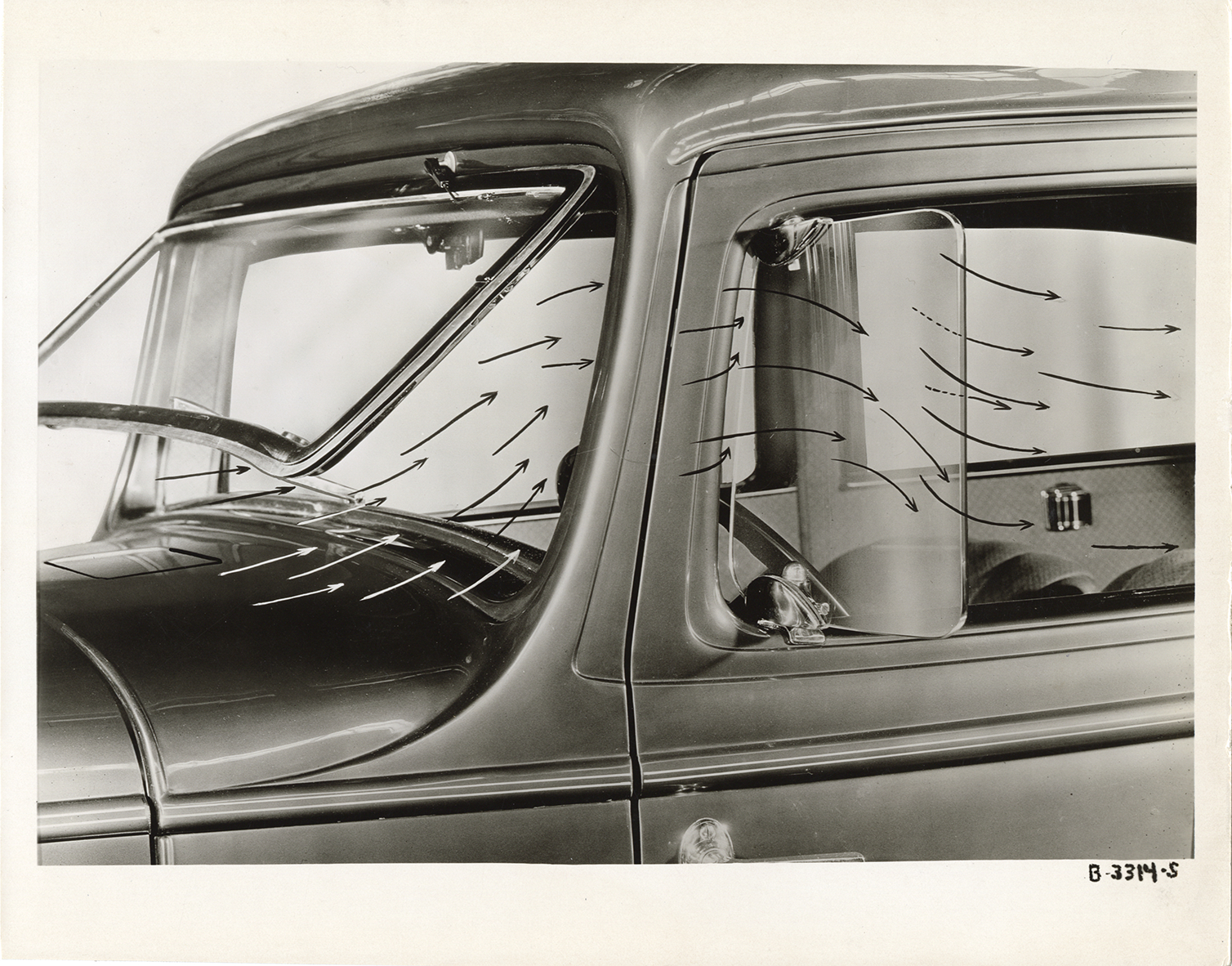 Illustration of air currents through open windshield and driver's side window on a 1933 Hudson car. Handwritten on back: "Dec. 17/32."