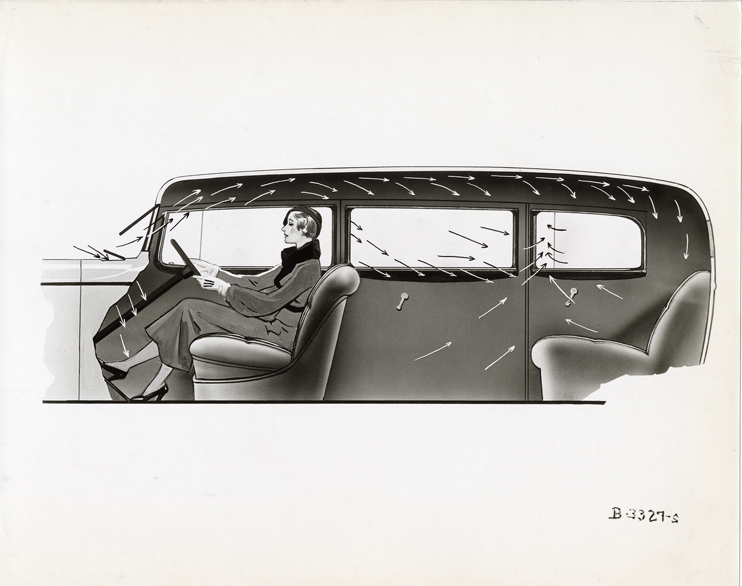 Illustration of air currents throughout a 1933 Hudson car. Woman driver in front seat. Handwritten on back: "Dec. 20/32. Copy negative of drawing showing air currents."