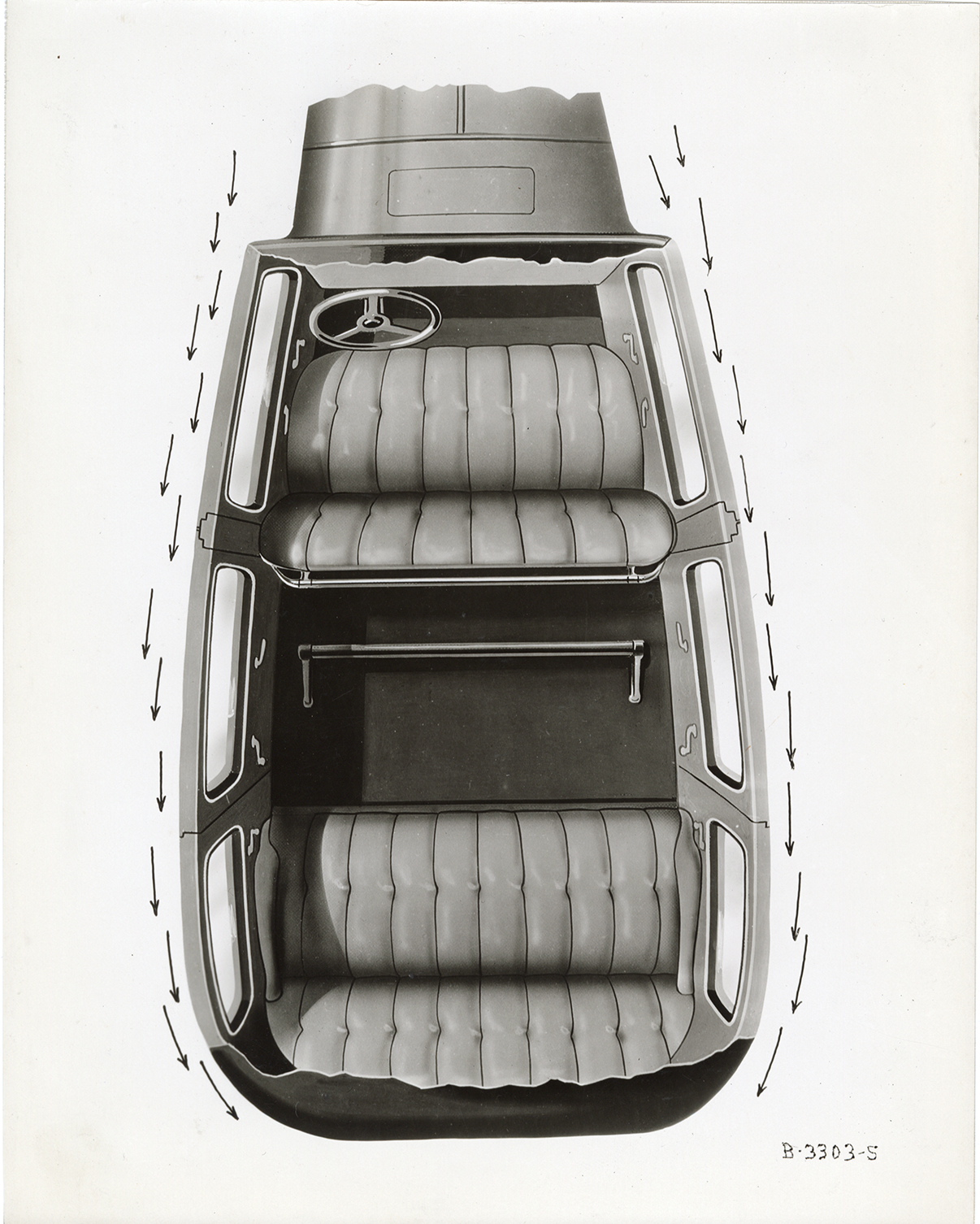 Illustration of air currents around exterior of a 1933 Hudson car, overhead view. Handwritten on back: "Dec. 17/32."