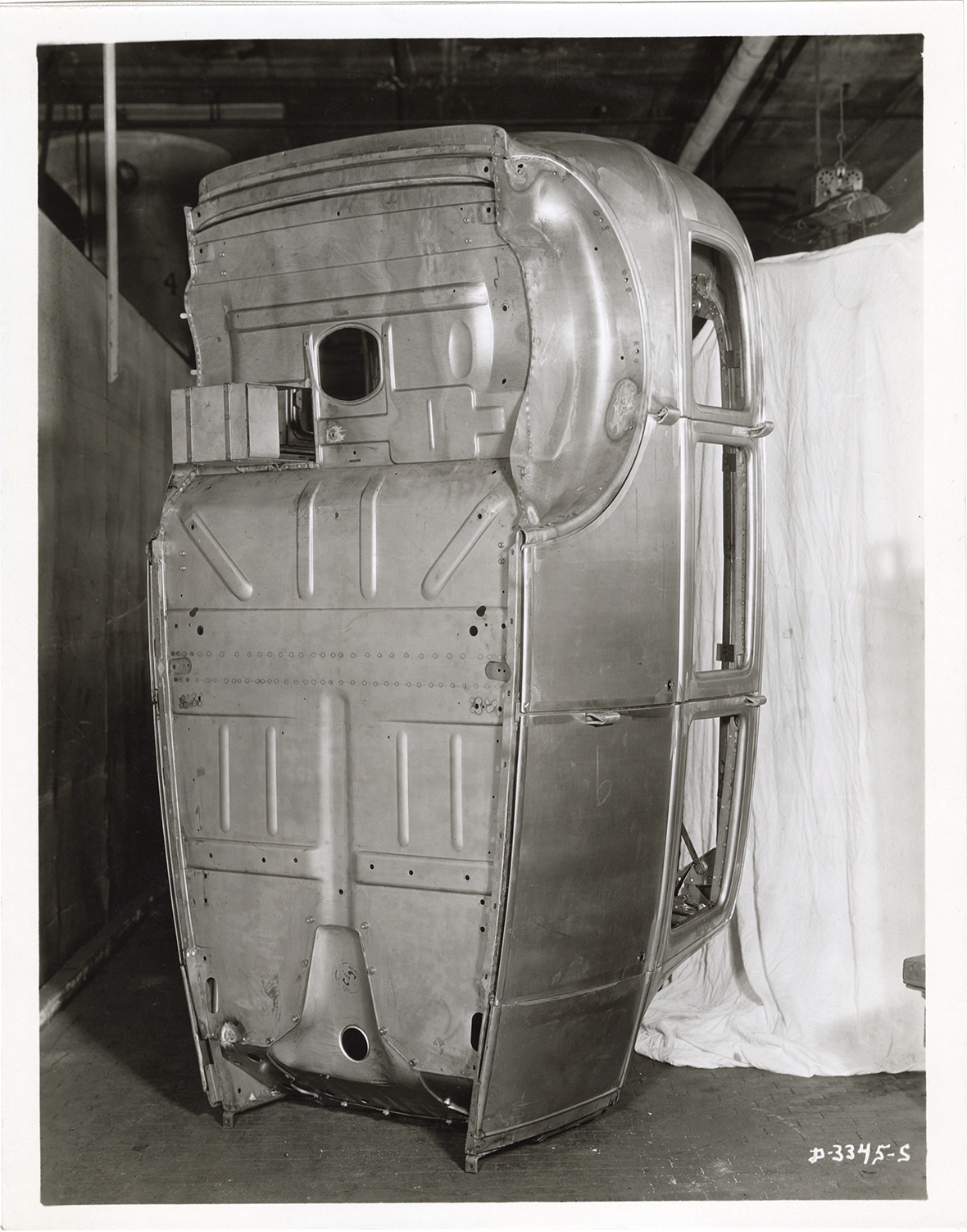 Bottom view of the steel body for a 1933 Essex Terraplane 8 Series KT sedan. Handwritten on back: "March 15/33. KT. Essex Terraplane 8 sedan steel body, showing bottom & side view."