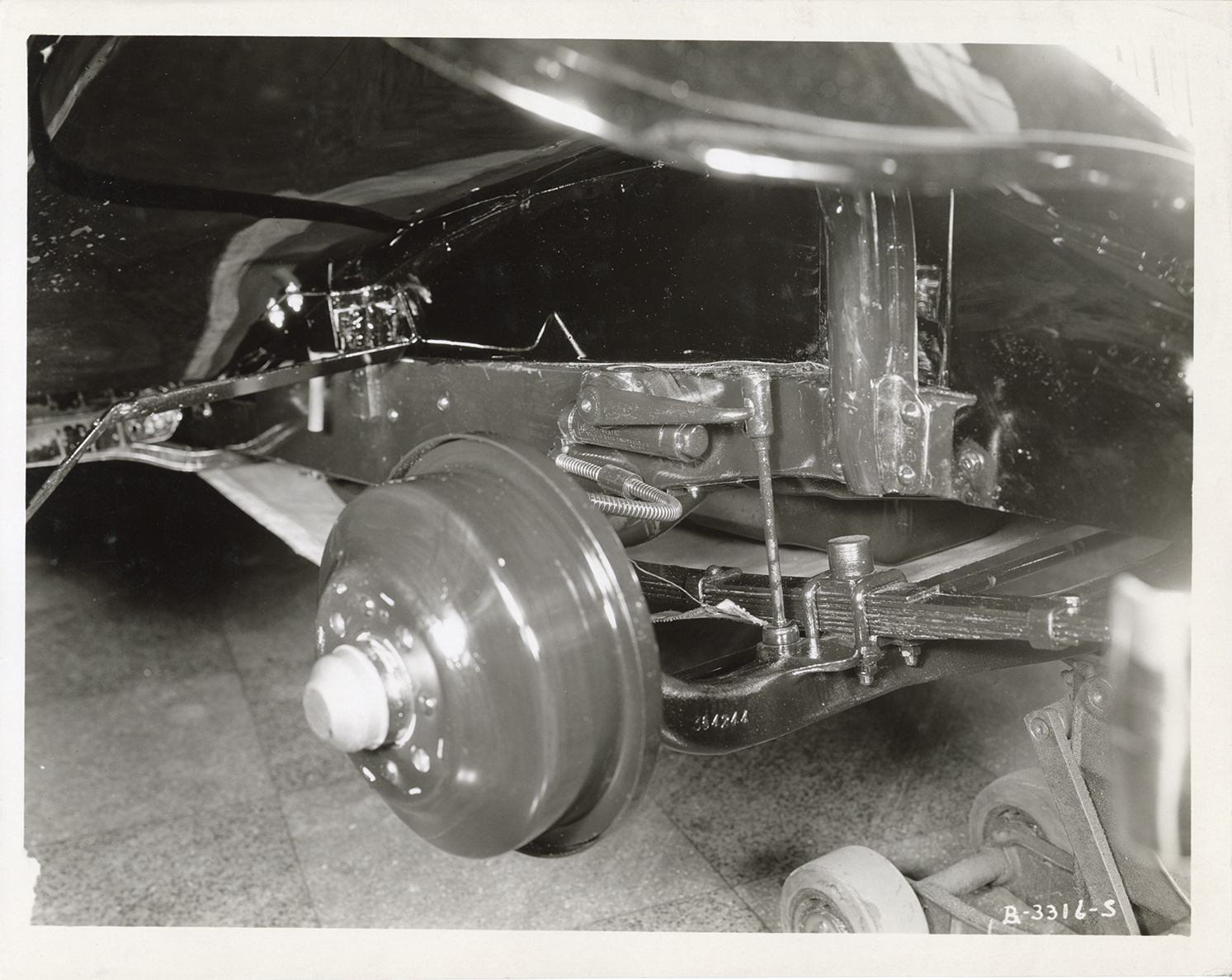 Close-up view of the right front shock absorber on a 1933 Essex Terraplane 6 Series K car. Handwritten on back: "Dec. 19/32. K. Essex Terraplane '6' right front shock absorber."