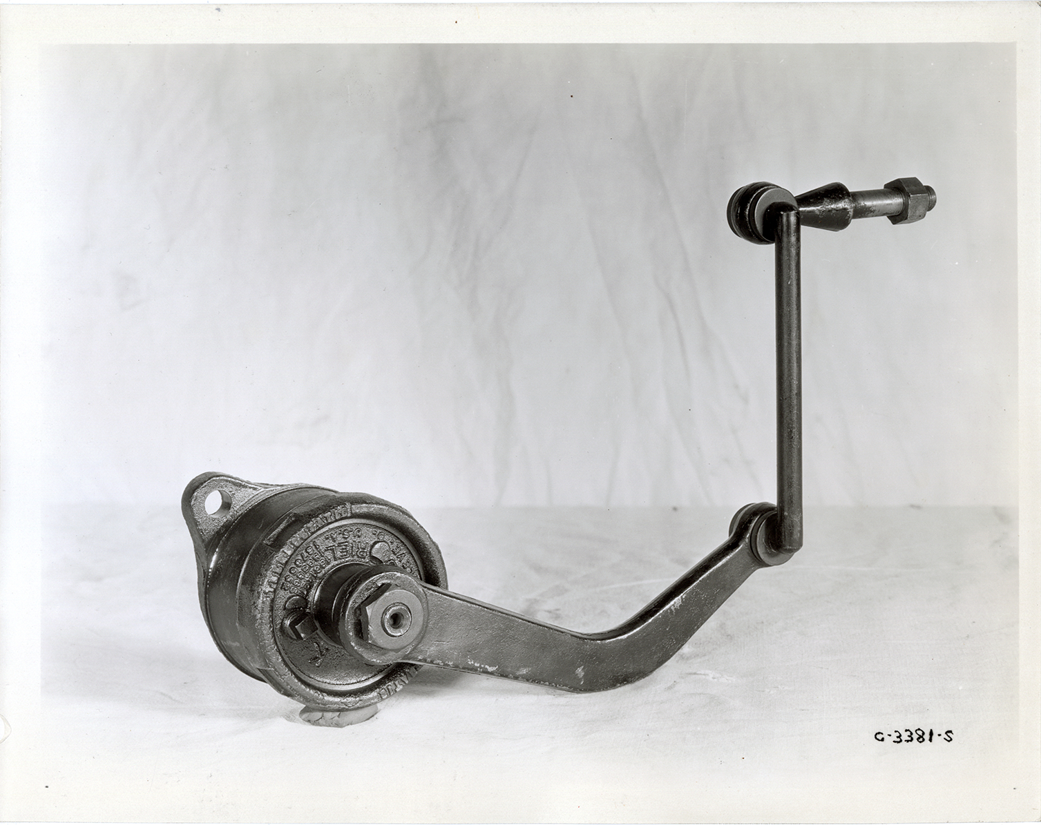 View of a two-way shock absorber for 1933 Hudson 8 Series T and L cars. Handwritten on back: "2-28-33. Model T & L (Hudson 8) two-way shock absorber. R. rear."