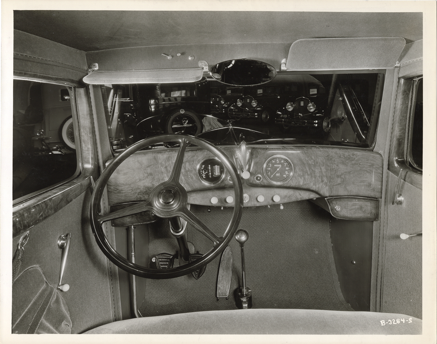 View of the instrument panel and steering wheel of a 1932 Hudson Special sedan. Handwritten on back: "Oct. 29/31. Showing controls and instruments, Hudson Special sedan (taken from rear seat). Cowl ventilator knobs should be black. One white (right in photo) & one black shown in this picture."