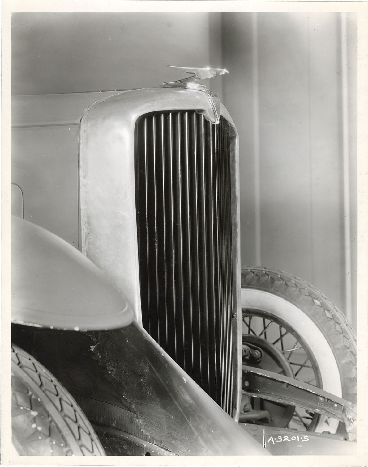 View of the front end of a 1932 Hudson car, showing grille and radiator ornament. Handwritten on back: "8/3/31. Hudson radiator. Close up of right front view. See A3256S - A3260S."
