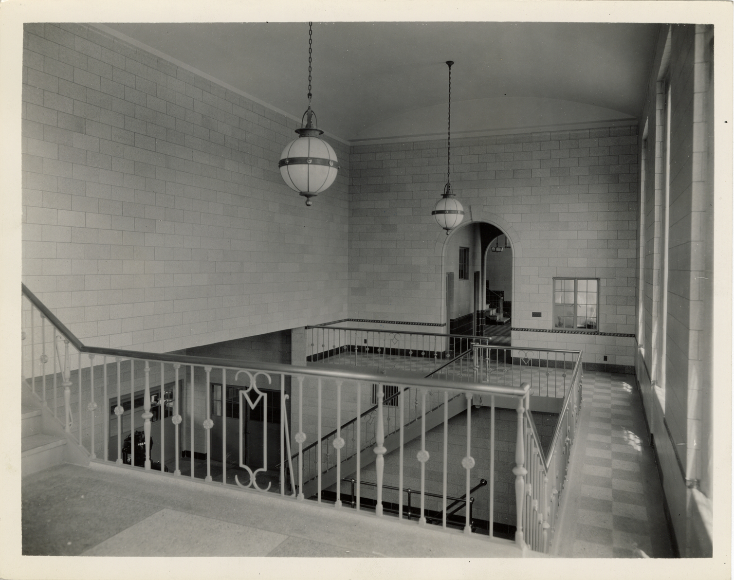 Interior view of the Sewage Disposal Plant in Dearborn, Michigan, showing tiled walls and floor. Railings border landing; spherical lighting fixtures overhead. Stamped and handwritten on back: "Federal Seabord Terra Cotta Corporation. 10 East 40th St., New York City. Order no. 886-S. Building: Sewage Disposal Plant. Location: Dearborn, Mich. Architect: Hubbell, Hartgering & Roth. Contractor: W.H. Mueller & Co."
