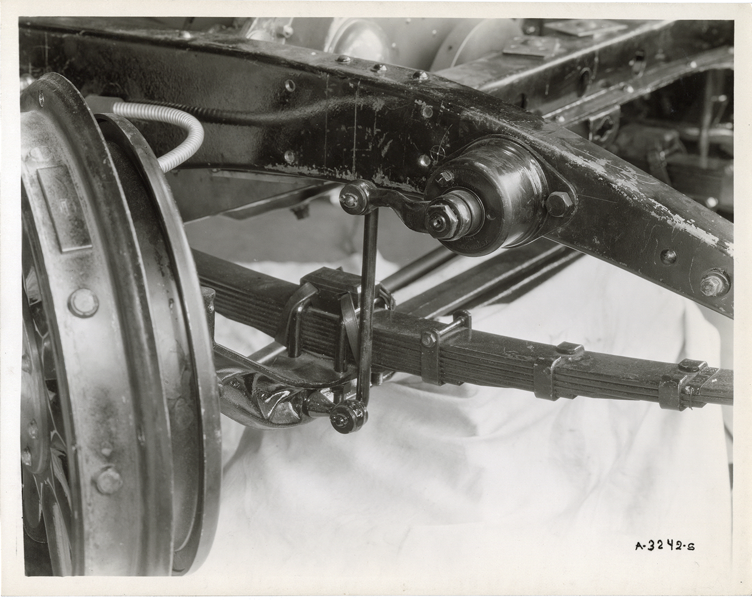 View of right front shock absorber for a 1932 Hudson car. Handwritten on back: "8/24/31. Preliminary Hudson right front shock installation. Will require correction for manual shock absorber control."