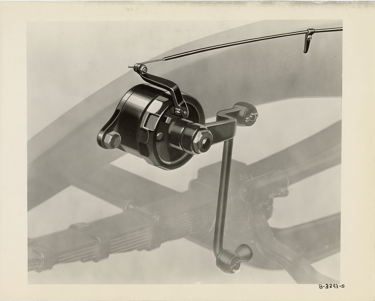 Artist's depiction of shock absorber and ride control for a 1932 Hudson car. Handwritten on back: "Nov. 4/31. Copy negative of retouched photo of Hudson shock absorber & ride control."