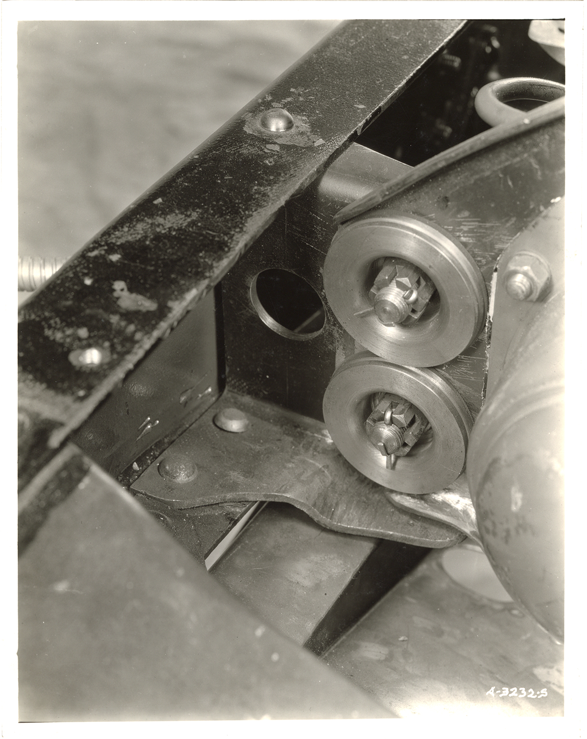 View of right front motor support for a 1932 Hudson car. Handwritten on back: "8/20/31. Hudson right front motor support, mounted in rubber."