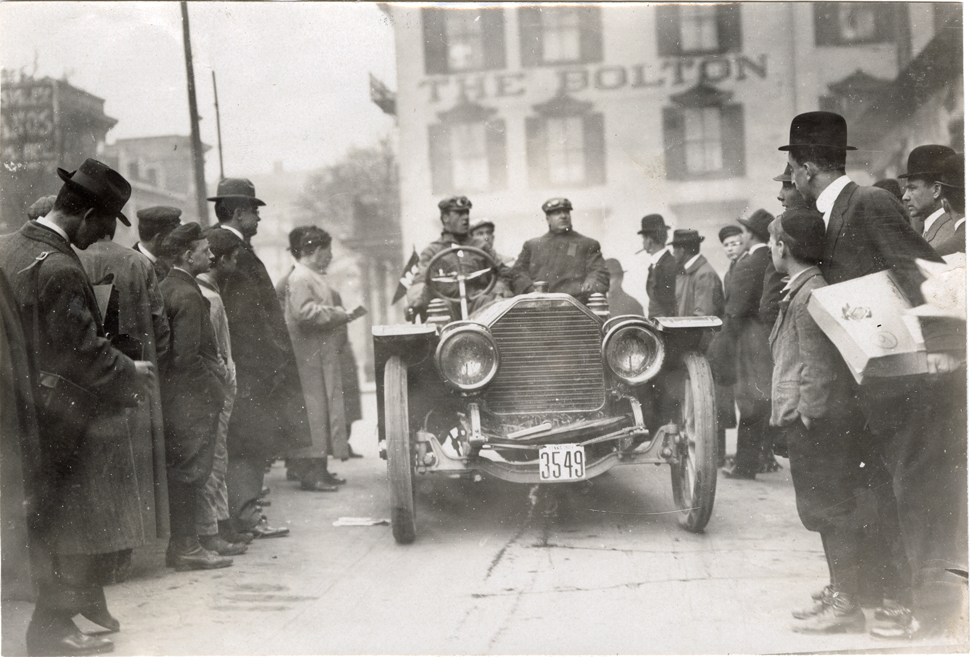 View of motorists in a 1909 Peerless car at Harrisburg, Pennsylvania during the 1909 Harrisburg Endurance Run. Spectators surround car; Bolton Hotel in background. Sponsored by the Motor Club of Harrisburg, Pennsylvania, the reliability contest covered routes through Maryland, Pennsylvania and Washington, D.C. Stamped on back: "Spooner & Wells, Inc., photographers, telephones 3472-3473 Columbus, 1931 Broadway, New York." Handwritten on back: "Peerless, 1909."