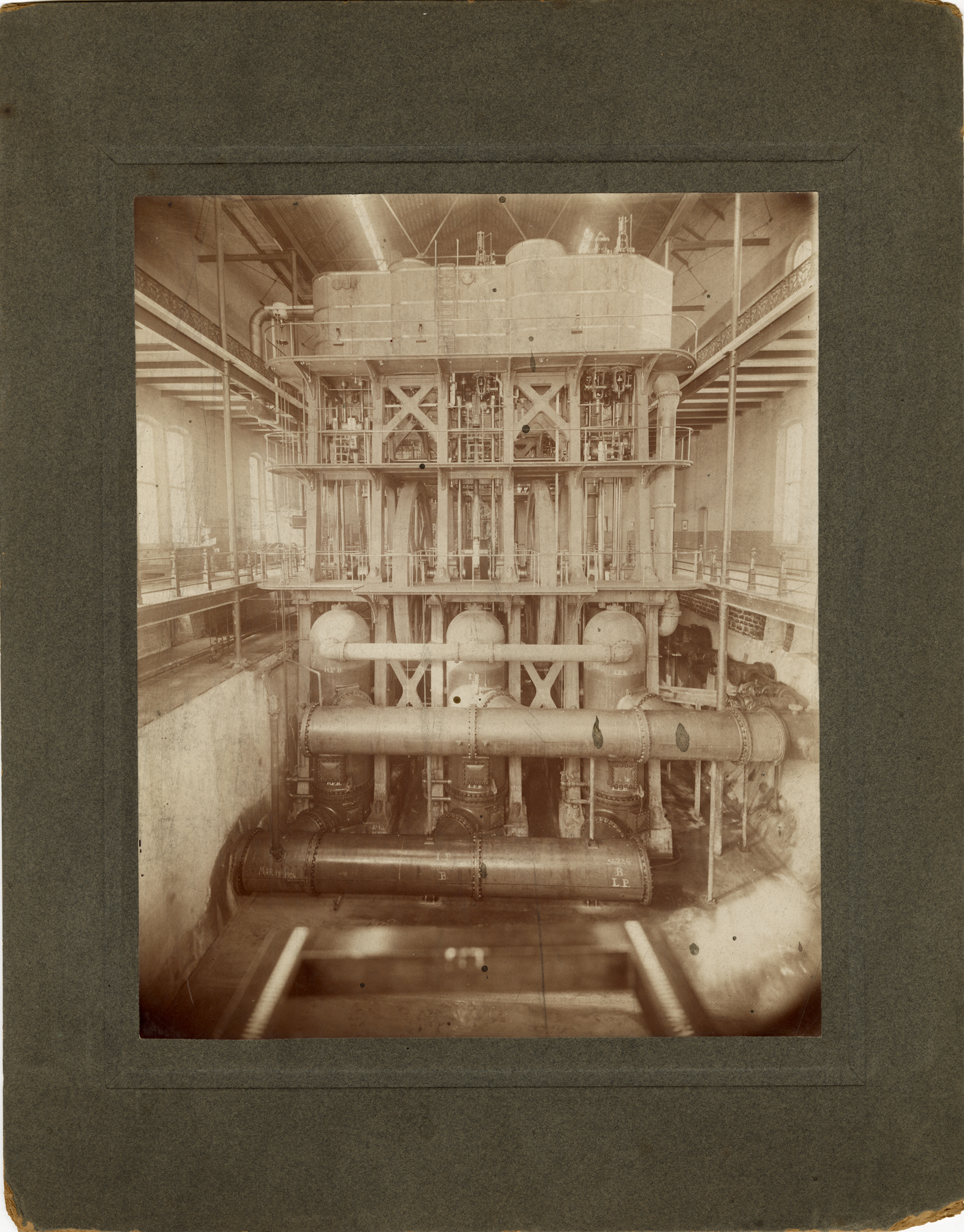 View of the interior of a pumping station at Waterworks Park, Detroit water supply system.