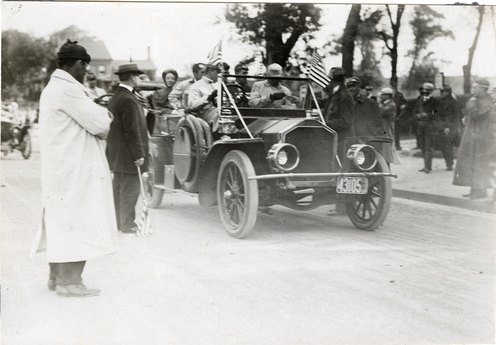View of motorists in a 1908 Pullman car. Stamped on back: "Spooner & Wells, Inc., photographers, telephones 3472-3473 Columbus, 1931 Broadway, New York." Handwritten on back: "Pullman, 1908."