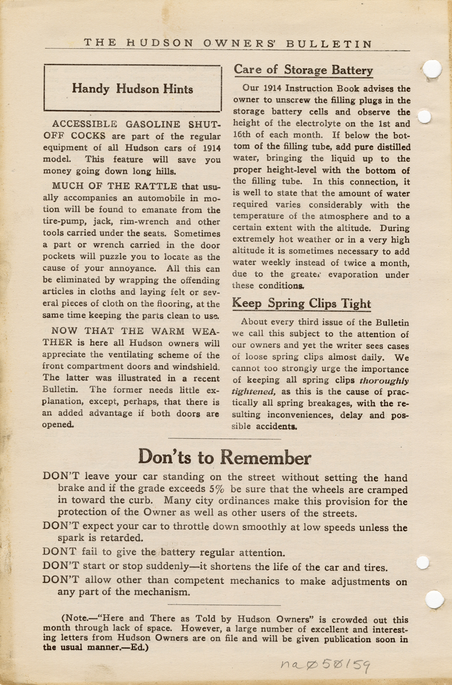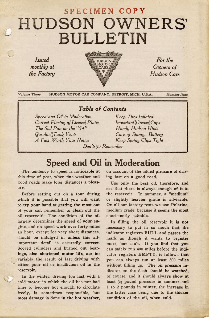 Hudson owners' bulletin : issued monthly at the factory : for the owners of Hudson cars / Hudson Motor Car Company. v. 3, no. 9