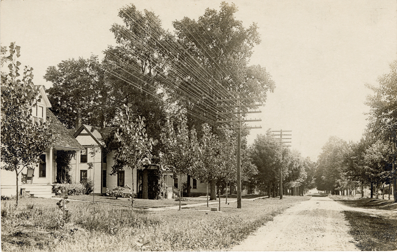 View of wooden-frame houses, partially obscured by trees, on Ash St. in Mason, Michigan. Printed on back: "Genuine photograph. C.R. Childs, photographer post cards, Chicago." Handwritten on back: "Mason, Mich. Second Ward, looking E. on Ash St."