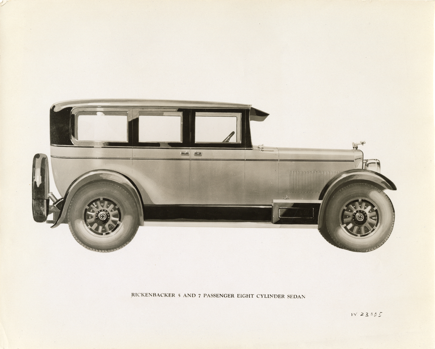 Artist's depiction of a Rickenbacker sedan. Printed on front: "Rickenbacker 5 and 7 passenger eight cylinder sedan." Handwritten on back: "Rickenbacker."