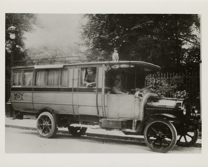 View of motorists and a dog posing with a 1917 De Dion-Bouton truck. Handwritten on back: "De Dion, 1917.