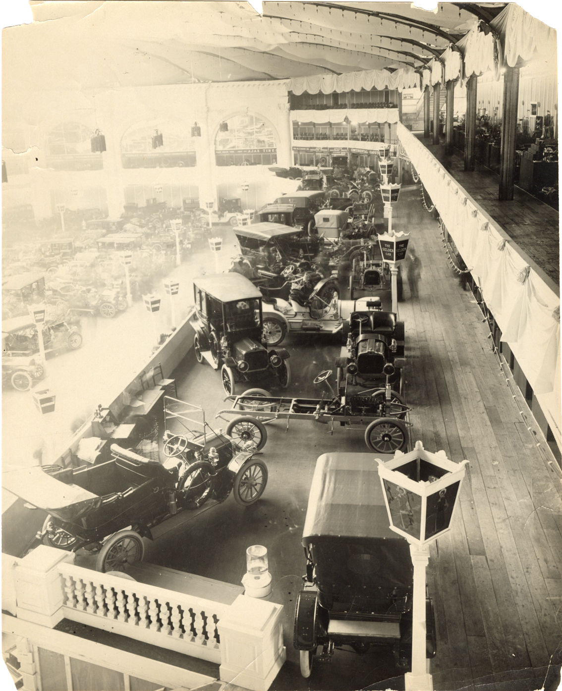 Bird's-eye view of Selden cars and chassis on display at trade show. "The Selden car" sign on right. Handwritten on back: "Selden, app. 1910."