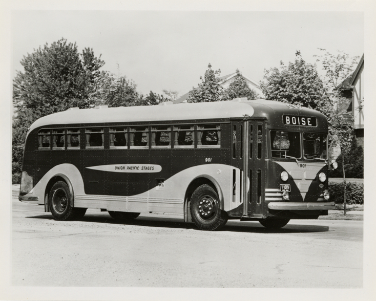 View of an Auto Interurban Lines bus for Union Pacific Stages. Handwritten on back: "Auto Interurban Lines, Spokane, WA."