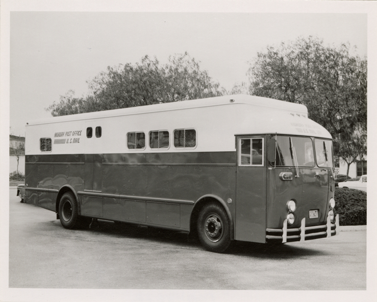 View of a Crown Highway Post Office bus. Handwritten on back: "Crown."