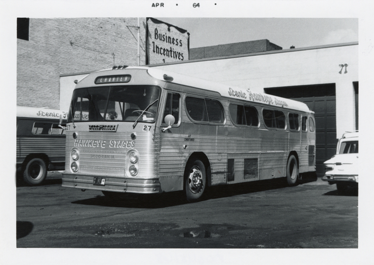 View of a Fitzjohn bus for Scenic Hawkeye Stages. Printed on front: "Apr 64." Handwritten on back: "Fitzjohn. Roadrunner. Scene Hawkeye Stages (Decorah, Iowa). Minneapolis, Minn."