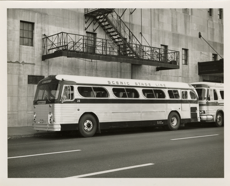 View of a Fitzjohn bus for the Scenic Stage Line. Stamped on back: "Oct 1964." Handwritten on back: "Fitzjohn."